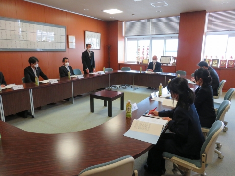 「学校訪問」の始めには、本校の教職員からご来校いただいた皆様に、今年度の学校の状況について報告し、質疑を受ける時間がありました。今年度の本校の特徴的な取組である「ダイバーシティを尊重する学校づくり」「連絡アプリ『Cラーニング』の活用」「タブレット端末や話し合い活動を積極的に取り入れた授業づくり」について、特に時間を割いて説明をしました。