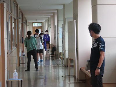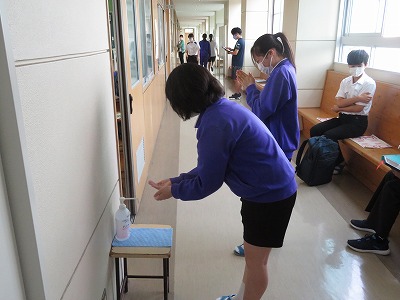 学校では、この状況の中での登校開始にできる限りの対応をしようということで、初日から先生たちが廊下で登校する生徒を待ち構えて、健康状況のチェックを入念に行いました。子どもたちも、この状況に危機感をもつ子が多いのか、廊下に設置した消毒液で、こまめに手指消毒をする様子が見られました。