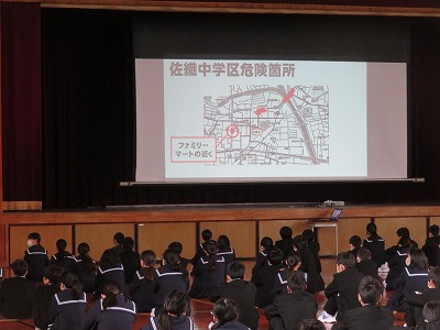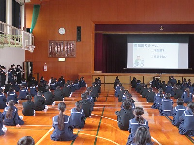 朝礼後には、交安委員会の計画による「交通安全集会」が行われました。交安委員の子たちが工夫をしながら、自転車通学に関する約束や校区内の危険箇所について、全校で確認をしてくれました。