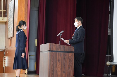 朝礼の最初には、前期の「学級委員」「議員」の認証式が行われました。