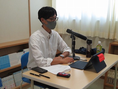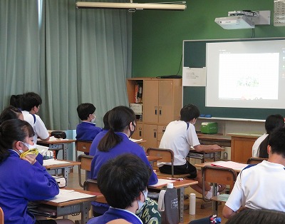先週の金曜日には、10月に2年生で実施予定の「職場体験学習」に向けて、市内で蓮農家をされている「田島蓮園」の方にお越しいただき、出前授業をしていただきました。緊急事態宣言中ということで、講師の先生には図書室でお話をしていただき、オンラインで子どもたちがいる各教室と結んで授業をしていただきました。