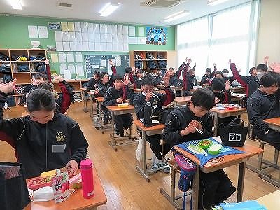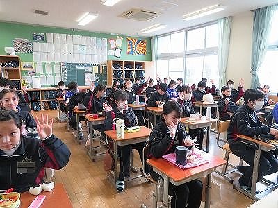 昨日の給食の時間、教室をのぞいて見ると1年生は「お弁当」を食べていました。先月、新型コロナウイルス第6波による「まん延防止等重点措置」が愛知県に発令された影響で1年生が2月1日に予定していた「校外学習」が急きょ延期になったため、弁当持参での登校となりました。
