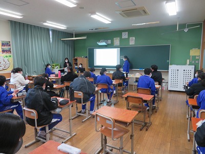 授業参観は、1年生は各教室で行いました。2年生に向けての見通しをもつ中で、これまでにも学習をした「SDGs」との関連を確認しました。教室に設置されたプロジェクターも大活躍でした。