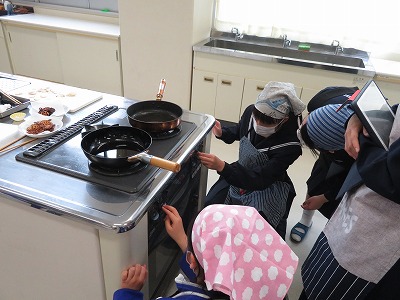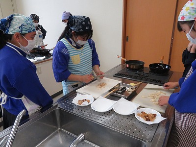 今回は3学年とも、地元の特産物である「蓮根」を使って、切ったり火を通したりする実習を行い、手際よく調理する子に注目が集まるだけでなく、調理に慣れていない子が恐々と包丁を使ったり、フライパンに慎重に材料を入れたりする様子を仲間が励ますなど、友だちの意外な一面が広がる調理室は、とても明るく温かい雰囲気に包まれていました。