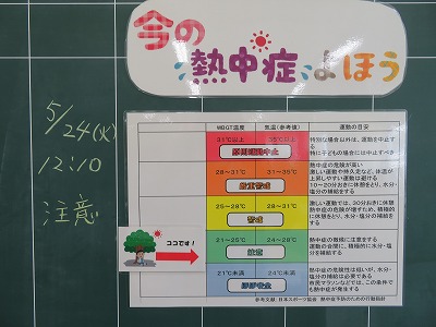 職員室では、今週初めから「熱中症レベル」を表示する掲示物が登場しました。熱中症の危険度を表す「WBGT指数」を、朝・昼に表示して、先生たちに情報提供と注意喚起を進めます。この取組は、ここ数年継続して養護教諭が実施をしてくれていますが、その時々のタイムリーな情報が分かりやすく示されていて、子どもたちの安全確保に大きく貢献してくれていると感じます。
