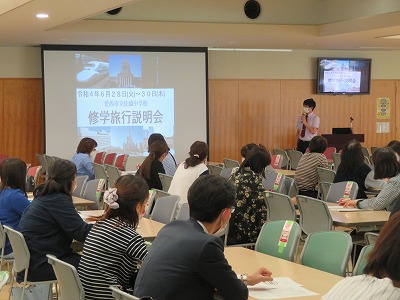 その後に行った「修学旅行説明会」では、6月28日(火)から2泊3日で実施予定の修学旅行の行程や準備、その他さまざまな安全面での対応・対策について、学年主任から説明をしました。