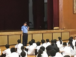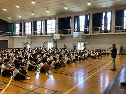 訓練の最後、体育館に集まり警察の方、校長先生からまとめの言葉をいただきましたが、生徒の皆さんはてきぱきと行動することができ、大変良かったと思います。