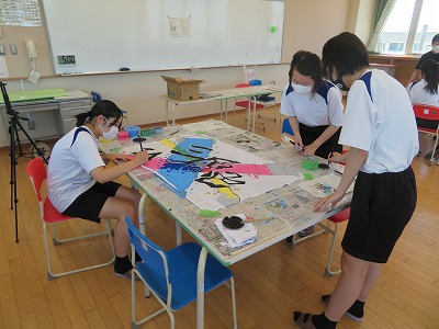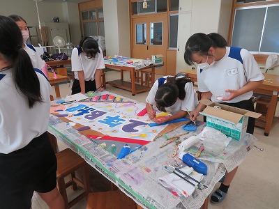 7月の下旬から2週間ほどかけて、各クラスの代表生徒が一生懸命に「学級旗づくり」に取り組みました。夏休み前に各クラスで旗のデザインを考え、その下書きと彩色に取り組みました。