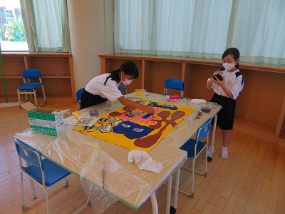 クラスによって、同じ子たちでコツコツ取り組むクラス、日によって人が入れ替わって分担して作業をするクラスなど違いが見られて興味深かったです。出来上がった学級旗が、学校祭で披露されるのが、今から楽しみです!!