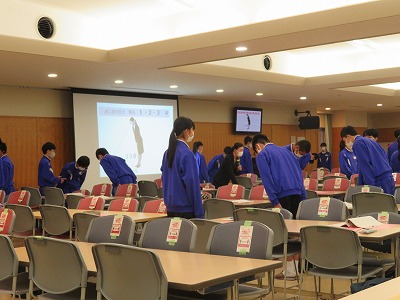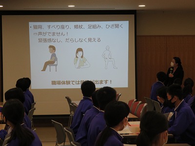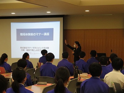 来週の火曜から木曜まで、2年生は「職場体験学習」を実施します。そこで昨日の午後には、講師の先生をお招きして「マナー講座」を行いました。