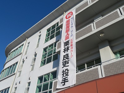 10日ほど前に、本校の校舎南側に新たな「懸垂幕」が飾られました。この「懸垂幕」は、本校卒業生で現在広島カープで活躍する栗林選手が、昨シーズンのセントラルリーグ最優秀新人賞を受賞したことを受けて、「地域の応援団」の皆さんのご厚意により作成されたものです。ちなみに、同様の懸垂幕は勝幡小学校にも掲げられています。
