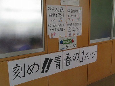 また、修学旅行については、説明した先生も含めてワクワクする気持ちが伝わってくる時間になり、よい3日間にしたい子どもたちの思いを感じることができました。ちなみに、3年生の教室前廊下には、アツイ「修学旅行テーマ」も掲示されています。何より感染症の状況がひどくなることなく、計画どおり2泊3日の旅行が実施できることを願うばかりです。