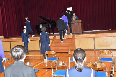 3年生の卒業まで、あと3日となりました。 そんな感慨深い1週間の始まりでしたが、昨日は本校2年生での新型コロナウイルス感染症の陽性者と発熱等による欠席者が週末を経て急増したため、登校前に急きょ2年生を「学年閉鎖」するという慌ただしい初日となりました。 そんなバタバタした朝でしたが、全校で集まって行う「3年生最後の朝礼」も、「3年生を送る会」と同様に集会形式は控え放送で1・3年生を対象に行いました。 1・2時間目には、いよいよ木曜に当日を迎える「卒業式」の総練習を3年生と関係の先生で行う予定をしていましたが、こちらも校内の状況を考えて、急きょクラスごとの個別練習に変更して当日の流れを少人数で確認することに変更しました。 「最後の週」の始まりということで、今まであまり実感のない子もいた3年生も、先週の「3年生を送る会」などを通じて、さすがに「終わり」を現実として(ようやく)意識し始めているように感じました。気付いた時には、卒業まで残りわずかとなっていますが、限られた時間を目一杯楽しく有意義に過ごして、思い残すところなく旅立ちを迎えてほしいと願います。