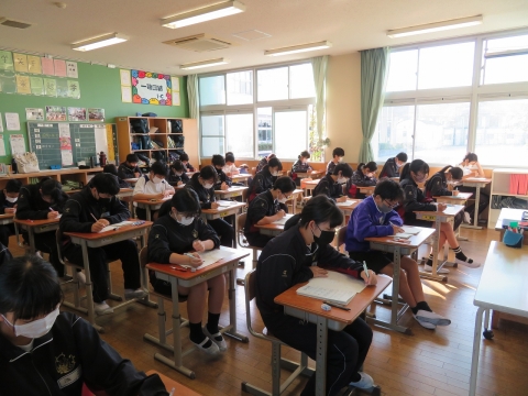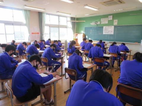 火曜日と昨日には、「第3回復習テスト」を実施しました。どの学年の子たちも、かなり集中した雰囲気で試験に臨む様子が見られました。その中でも、特に目を引いたのは3年生と1年生でした。進路決定に向けた「山場」を迎えている3年生の目の色が変わるのは納得かと思いますが、1年生については、中学校に入って初めての「通知表」を先月もらった後から「やばい」「ちょっと真剣にやらなきゃ」と言っている人が増えていたことからも、自分自身の勉強への取組を見つめなおしたことが伝わってきました。