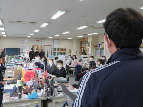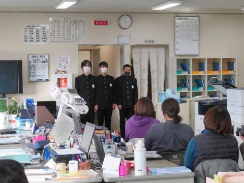 月曜日の授業後、先生たちが揃っている「職員室」に、3名の2年生徒が来ました。この3人は、卒業式や入学式で校旗を運ぶ「旗手」候補です。ちなみに旗手として承認される段取りとしては、学年の先生方から推薦された3名が、全教員に自らの意気込み等を語った上で、最終的には校長先生の承認を得て正式に「旗手」と認められます。
