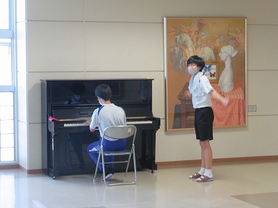 先月中旬から、校舎2階の来賓玄関前にアップライト型のピアノが置かれていて、休み時間には、そのピアノを自由に弾く子、その周りで楽しそうに聴く仲間や先生たちの姿が多く見られるようになっています。