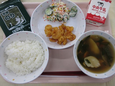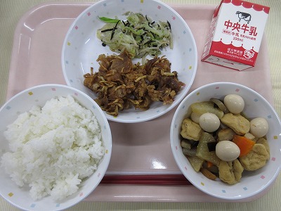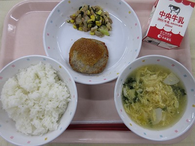 キムタク丼、牛乳、大豆ともやしのかみかみサラダ、鶏団子と春雨のスープ