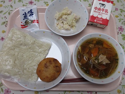 肉うどん、牛乳、手作りはんぺん、おかちゃんサラダ、乾燥小魚