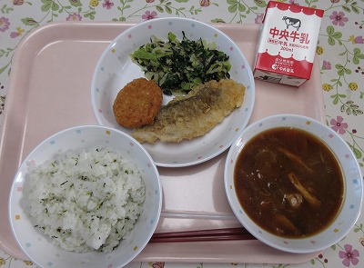 菜飯、牛乳、セレクト(A:トマトソース入りミンチカツ、たらのコンソメタツタ)、ひじきの磯香和え、じゃがいも団子のみそ汁