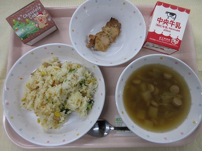 クリスマスピラフ、牛乳、ローストチキン、コンソメスープ、クリスマスケーキ