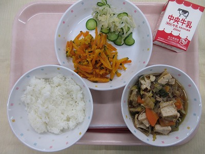 ご飯、牛乳、すき焼き風煮、かぼちゃの天ぷら、即席漬け