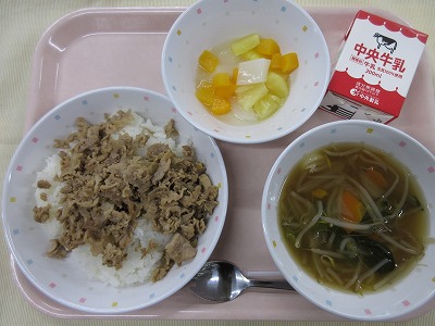 焼き肉どんぶり、牛乳、中華スープ、杏仁豆腐
