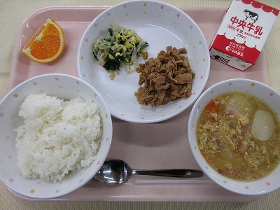ご飯、牛乳、ビビンバ(肉炒め、ナムル)、トックと卵のスープ、清見オレンジ 旬の果物の清見オレンジが登場です。清見オレンジは、みかんとオレンジをかけ合わせて日本で誕生したものです。みかんの甘さとオレンジのさわやかな香りが特徴で、人気の果物です。清見オレンジや、はっさく、いよかん、不知火などがおいしい季節ですが、柑橘類には、クエン酸が多く含まれ疲労回復効果が抜群です。また、柑橘類の香りには、高いリラックス効果も期待できることから、心も体も元気にしてくれるパワーがあります。季節の変わり目でストレスが溜まりやすい時期でもあるので、柑橘類でパワーアップ!
