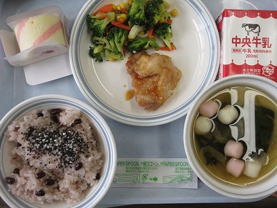 赤飯、牛乳、ごま塩、お祝い汁、鶏ステーキレモンソース、花野菜サラダ、お祝いデザート