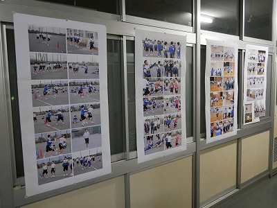 学年の廊下には、マラソン大会やバスケットボールの試合の写真が掲示されています。