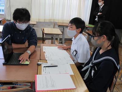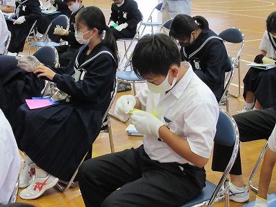 今日の6時間目、佐織特別支援学校の田代先生にお話をしていただきいました。特別支援学校の生徒さんたちとの交流をする中で、どのようなことに気を付けていけばよいのかを教えていただきました。音に敏感であったり、絵を見るときに異なって見えることがあったりするというお話もありました。細かい作業が苦手な生徒さんのことを理解するために、軍手をしながら折り紙を折るということを体験しました。これからの交流も楽しみになりました。また、ST後には交流委員と支援学校の先生方とのテレビ会議も行い、これからプレゼントをするおもちゃ作りについて、たくさんのアドバイスをしてくださいました。