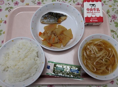 ご飯、牛乳、さわらの照り焼き、豚大根炒め、うどん汁、味付けのり