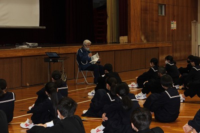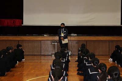 あいにくの雨天で、実際に自転車に乗っての実地訓練は行えませんでしたが、体育館で交通安全協会の方から、交通ルールについてやヘルメットを着用することの大切さなどの講話をしていただきました。