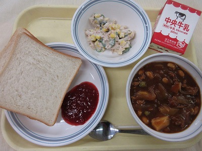 ≪今日の献立≫スライスパン、牛乳、手作りいちごジャム、ポークビーンズ、マカロニサラダ 今日は、調理員さん手作りのジャムが登場です。いちごのヘタを取って、砂糖とレモンを加え、丁寧にあくを取りながら、ゆっくり煮込みました。ジャムは、砂糖といちごの量のバランスが味の決め手になります。通常のジャムは、果物の量に対して50~100%の砂糖を加えて作ります。砂糖の量を多くすると、保存性が高まり、より安価に作ることができますが、果物本来の味が感じにくくなります。今日は、作ってすぐに食べるので、保存性のための砂糖は必要ないことから、よりいちごの味が感じられるように、砂糖の量を25%まで減らして作りました。「ジャム最高!」「いちご感が強くておいしかった!」と感想を言ってくれていました。