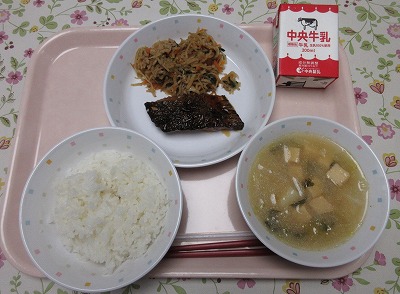 ご飯、牛乳、ぶりの三河みりん焼き、豚肉と切り干し大根のスタミナ炒め、白みそ汁