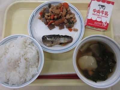 ご飯、牛乳、いわしの梅煮、大豆の五目煮、ごちそうすいとん汁