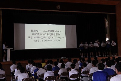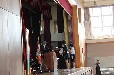 6年度最終日の今日、令和7年度生徒会認証および引継ぎ式、修了式が行われました。新執行部は気持ちも新たに7年度に向けての抱負を語ってくれました。また、修了式では第1学年、第2学年それぞれの代表者に、各学年の終了証が手渡されました。おめでとうございます。