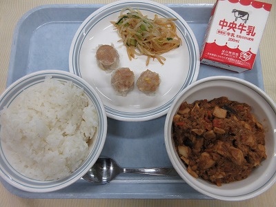 ご飯、牛乳、なす入りマーボー豆腐、コーンしゅうまい、うま塩もやし