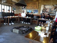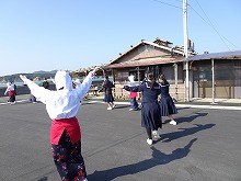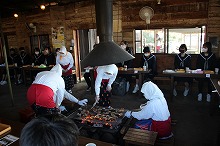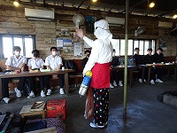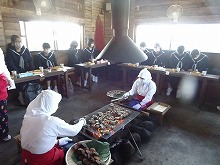 【海女小屋 八幡かまど】海女さんのお話を伺い、焼きたてのサザエ、桧扇貝や干物をいただきました。最後に、海女さんが踊りを紹介してくださいました。飛び入り参加させていただきました。