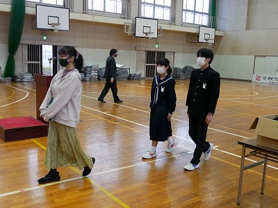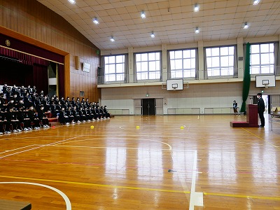 6年度最終日の今日、令和7年度生徒会認証および引継ぎ式、修了式が行われました。新執行部は気持ちも新たに7年度に向けての抱負を語ってくれました。また、修了式では第1学年、第2学年それぞれの代表者に、各学年の終了証が手渡されました。おめでとうございます。