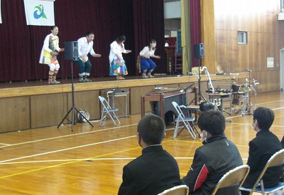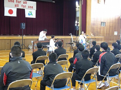 また、体育館で芸術鑑賞会をあわせて行いました。今年は、密を避けるため学年ごとに鑑賞しました。『にじいろ音楽隊』による楽器演奏の音楽鑑賞です。クラシックの名曲を、バイオリン、マリンバ、パーカッション、クラリネットの特徴を生かして演奏していただきました。また、曲「オンザグラス」をボディーパーカッションで演奏し、観客も参加させていただきました。今年は、いろいろなことが自粛される中、久しぶりにプロの音楽を、楽しく素敵に鑑賞することができました。