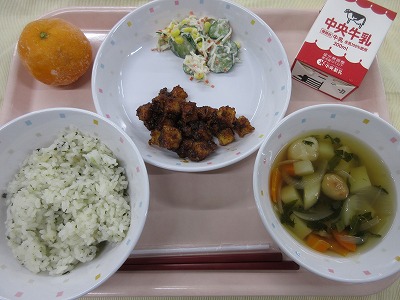 愛知の大根葉ご飯、牛乳、揚げ豆腐の肉みそ、かに風味サラダ、玉麩汁、冷凍みかん