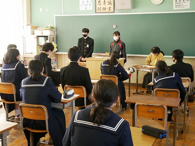 本校には2つの小学校から新入生を迎えます。その新入生を中学校に招き、生徒会を中心に西中での中学校生活についての説明会を行いました。授業の様子や自転車通学のルールなどを分かりやすく教えてくれました。