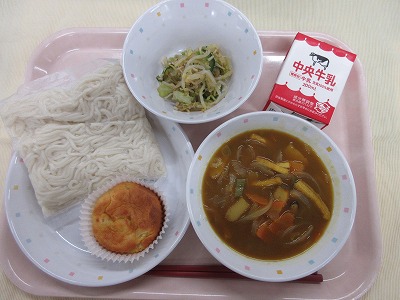 カレーめん(ソフトめん)、牛乳、じゃこのおかか和え、手作りパインケーキ