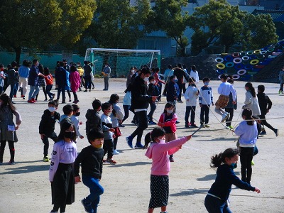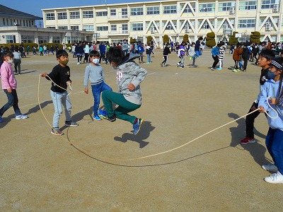 3月3日、コロナの影響で延期されていた「なわとび教室」が佐屋小の体育館で行われ、5年生が参加しました。講師の粕尾将一さんから、なわとびがうまく跳べるための運動や練習の仕方を詳しく教えていただきました。45分の講義でしたが「初めて二重跳びができた」「三重跳びもできたよ」と言う子が何人もいました。あっという間の楽しい「まっちゃんのなわとび教室」でした。最後にまっちゃんからは「5分でいいから毎日なわとびの練習を続けることが大切です」と、教えていただきました。 粕尾将一(縄のまっちゃん)さんは、元Cirque du Soleil(シルク・ドゥ・ソレイユ)アーティスト、なわとび競技アジアチャンピオンというものすごい経歴の持ち主で、現在「名古屋なわとびスクール」で講師をつとめ、多くの子ども達になわとびを教えていらっしゃいます。 講師をしていただいた粕尾将一さんは日本なわとびアカデミーの代表理事でもあり、なわとび教室を日本各地で実施し、なわとびの指導法研究と普及を通じ、子どもの健やかな成長と縄跳び競技の発展の寄与するために活動をしていらっしゃいます。