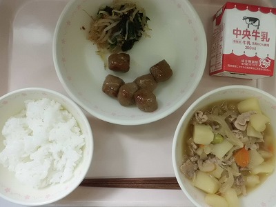 ごはん 牛乳 ミートボールの照り焼きソース 肉じゃが ほうれん草のおかか和え