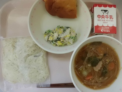 ごはん 牛乳 ホキのチリソースがらめ ビーフン入り野菜炒め 八宝湯