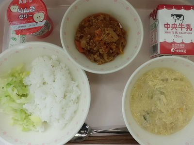 ごはん 牛乳 タコライスふう(ぐ・キャベツ) コーンエッグスープ りんごゼリー