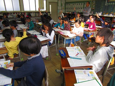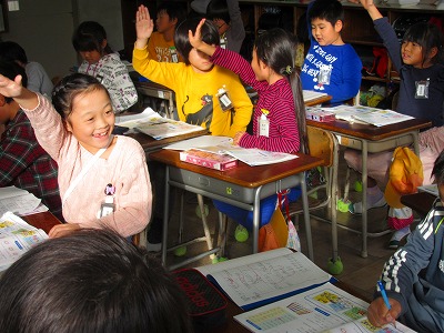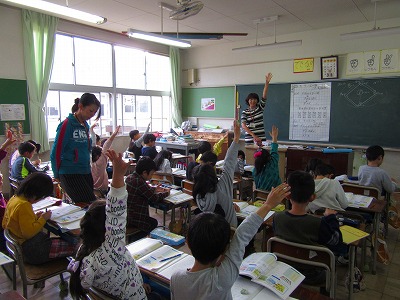2年生が算数で教科書にある九九を使ったなぞなぞを楽しく解いていました。「ごごのおやつはいくつ?(答え25)」「にしからとんできたのはなに?(答え8)」など、式を立て九九を利用して答えを出していました。