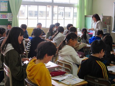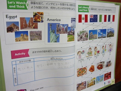 5年生が英語活動に取り組んでいました。どのような国へ行って、その国で何がしたいのかを言い表す学習でした。「I want to go ~.」「You can see(eat,buy) ~.」の表し方を学んでいました。