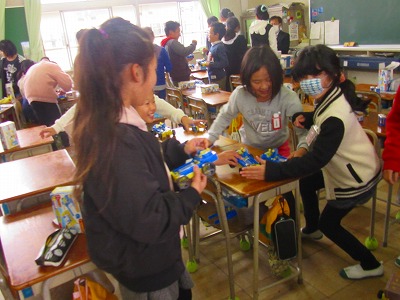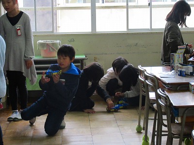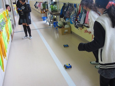 5年生が理科の学習で実験セットで作った電気で走る車を走らせていました。実際に車を走らせることによって、電気の流れと力を確認することができました。